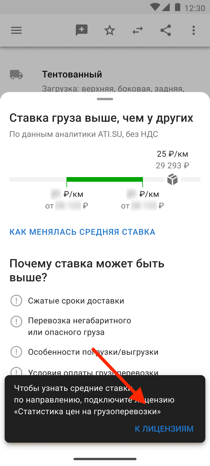 Если у вас нет лицензии, вы увидите, что ставка выше рынка. Чтобы видеть, что ставка в рынке или ниже, подключите лицензию «Статистика цен на грузоперевозки» для отслеживания изменений цен. Так вы сможете видеть, когда ставки по направлению растут, и аргументировать заказчику, почему ваши услуги подорожали.