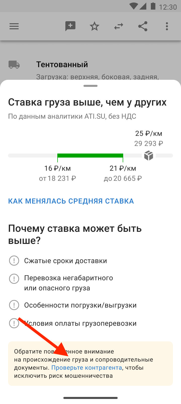 Мы предупреждаем, если у груза слишком высокая ставка, и рекомендуем проверить контрагента, чтобы избежать рисков.